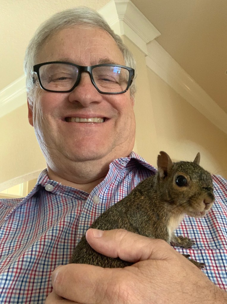 Ron found Bobby T. Squirrel when he was a newborn. The veterinarian believes his mother rejected him because he didn’t suck properly due to a mouth deformity. Ron raised Bobby until he was old enough to release. Now Bobby comes often to visit his pal.